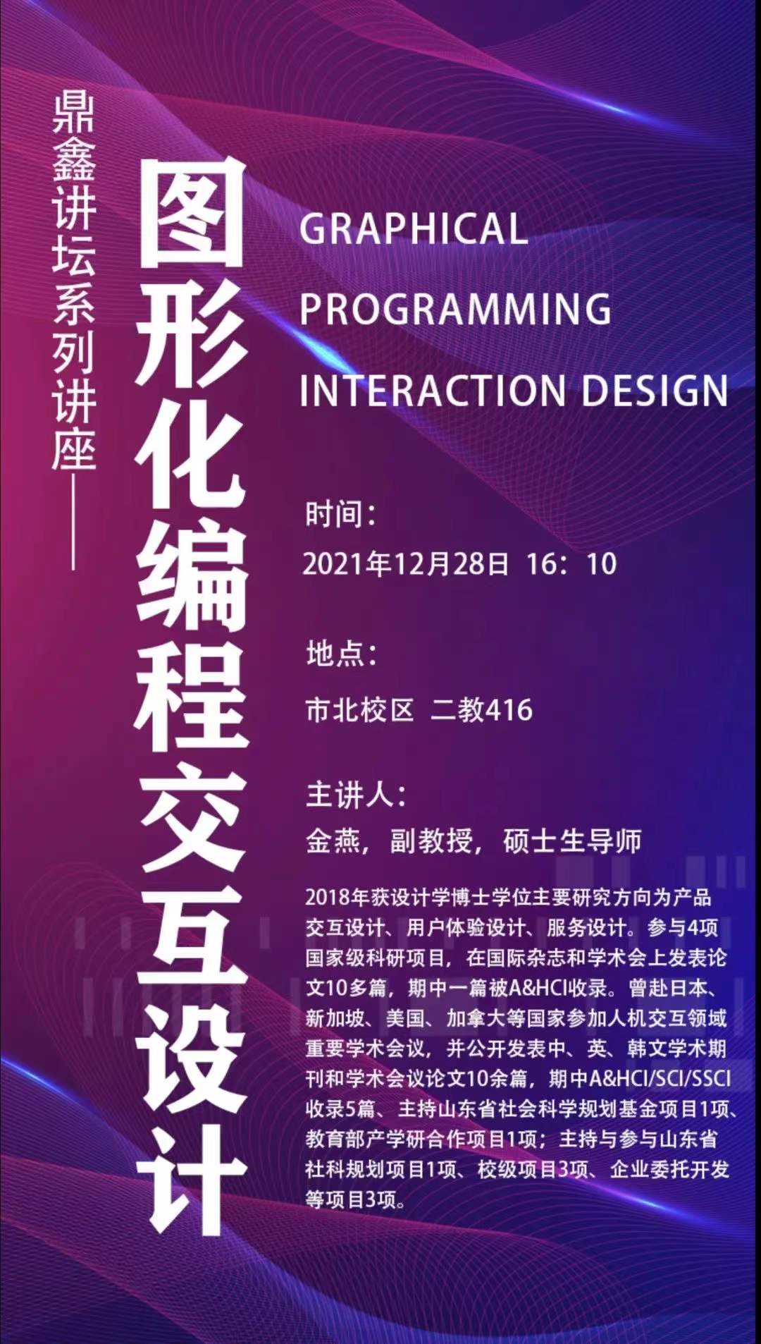 为更好地营造浓郁校园学术文化氛围,12月28日下午,鼎新讲坛系列讲座在球王会体育官网市北校区二教416成功举行,球王会副教授,硕士生导师金燕老师以人机交互设计为切入点,结合编程语言,进行了《图形化编程交互设计》为题的学术讲座,球王会员工及部分青年教师参与了本次讲座。