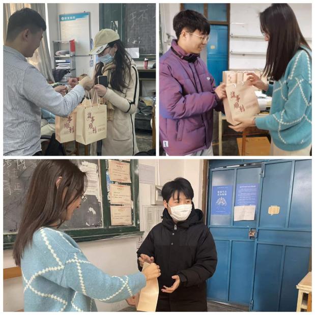 环设183团支部紧锣密鼓的为考研同学们精心制作了考研盲盒。大家合作分工,自动组成“流水线小分队”,有的折纸盒缠丝带、有的撰写卡片、有的进行分装和礼盒打包,现场氛围热火朝天,“不畏风雨,不惧风险”,“当下如水,未来如诗”,“考研上岸,一切顺遂”……一张张明信片写满期待,一声声问候温暖人心,一句句鼓舞充满希望。由张恬带队前往寝室、班级、图书馆等场所看望考研同学,为同学们送上考研盲盒,询问了同学们的备考情况,为同学们送去祝福,并提醒大家最后几天时间要调整作息、放平心态,坚持不懈,尽自己最大的努力去备战考研!