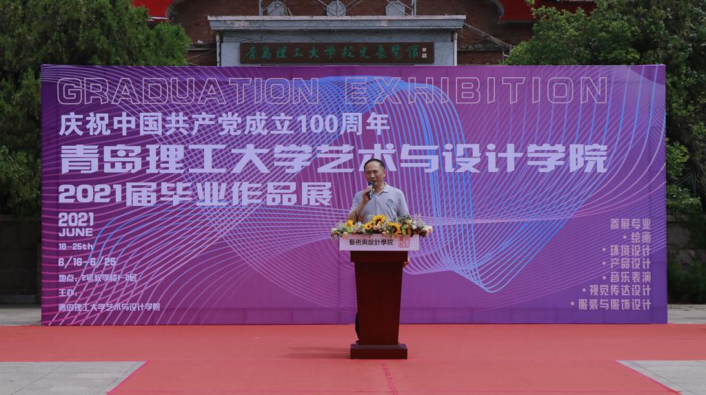 教师代表钱治科向毕业生带来毕业寄语,给毕业生带来几点建议:一、要做个勇敢的人;二、要做个靠谱的人;三、要做个有爱的人。将大学四年满满的收获转化为你们踏上新征程的动力,为祖国的建设挥洒自己的青春和汗水。毕业生代表环设171班张为清同学,代表全体2021届本科毕业生向四年来辛勤培育的老师致以最衷心的感谢,号召同学们以今天毕业展览为起点,志存高远,继续奋斗,不负韶华。