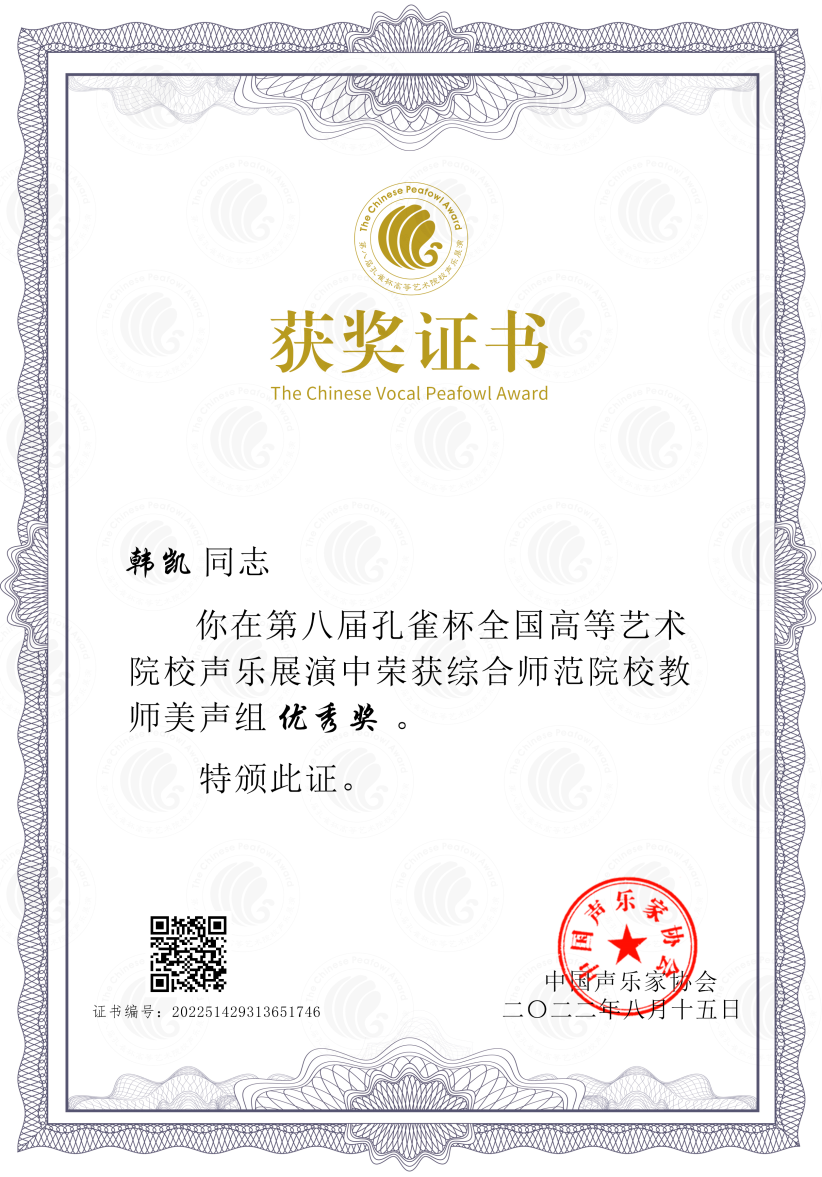 2022年8月8日至15日,第八届孔雀杯全国高等艺术院校声乐展演在宁波大学举行。来自全国260多所院校的1620名选手参加了本次活动。经过初赛、复赛、决赛的三轮比赛选拔,现场激烈角逐,公司球王会韩凯老师表现优异,以德语咏叹调《你是我心中的一切》获得综合师范教师美声组优秀奖。
