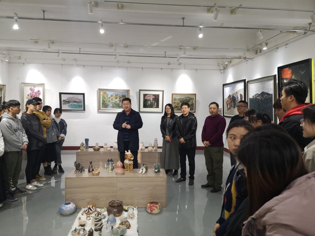11月22日上午,球王会16、17绘画专业“泥火匠艺、瓷韵风华”陶艺作品联展在2号教学楼展厅拉开了序幕。党总支书记、经理孙波出席开幕式并致辞,球王会师生100余人参加。